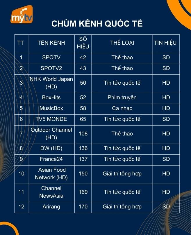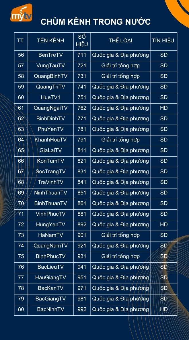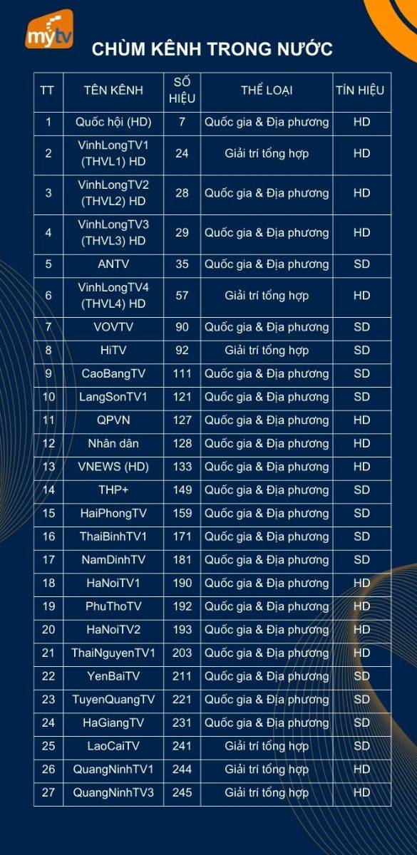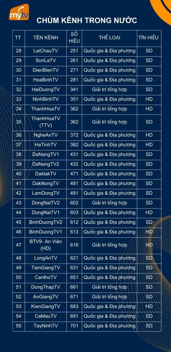 Với gói kênh MyTV chuẩn, người dùng có thể truy cập hơn 140 kênh truyền hình, từ các kênh quốc gia, quốc tế cho đến các kênh giải trí, thể thao và phim truyện. Tuy nhiên, để mở rộng trải nghiệm và tận hưởng nhiều nội dung phong phú hơn, gói MyTV nâng cao là lựa chọn hoàn hảo với danh sách kênh MyTV gói nâng cao lên đến hơn 170 kênh truyền hình đa dạng và chất lượng.