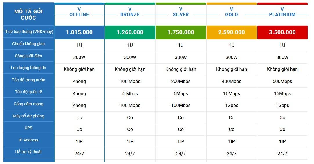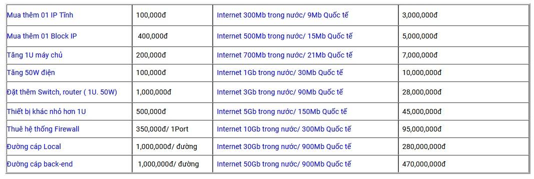 BẢNG GIÁ CHO THUÊ CHỖ ĐẶT MÁY CHỦ