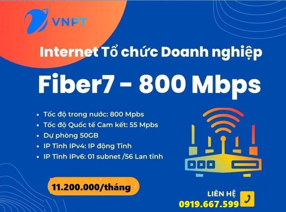 Fiber7 là gói cước nằm trong nhóm các gói Internet Doanh Nghiệp của VNPT. Với tốc độ 800 Mbps, không những tiết kiệm chi phí mà còn đảm bảo cho khách hàng về cam kết băng thông quốc tế tối thiểu lên đến 55 Mbps.