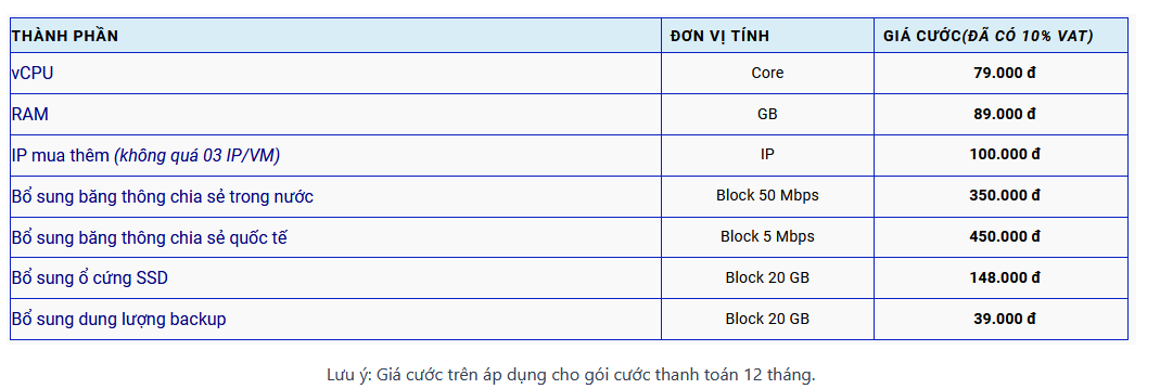 Chi tiết giá các dịch vụ bổ sung mua thêm, áp dụng cho khách hàng đăng ký sử dụng gói VNPT SmartCloud.