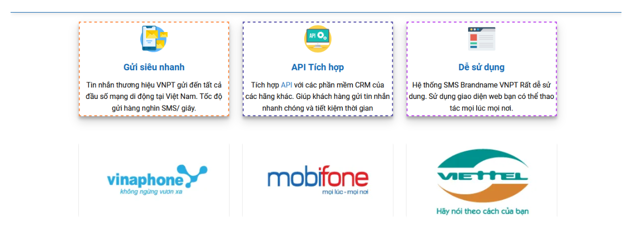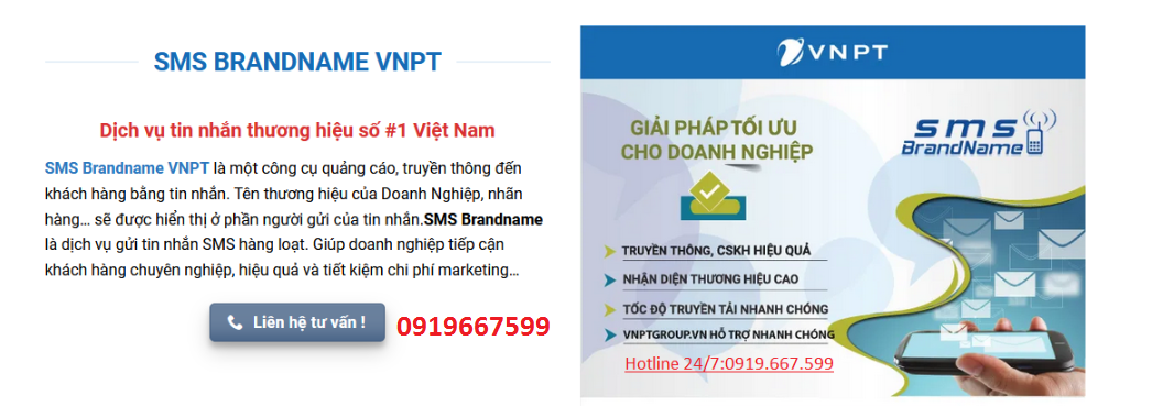 VNPT– Vinaphone là Tập Đoàn Viễn Thông hằng đầu Việt Nam. Sử dụng dịch vụ của VNPT giúp doanh nghiệp yên tâm về thông tin khách hàng. Hỗ trợ kỹ thuật chăm sóc khách hàng 24/24. Dịch vụ tin nhắn thương hiệu giúp doanh nghiệp tăng độ nhận diện thương hiệu, tiết kiệm chi phí. Tỉ lệ gửi tin nhắn đến đầu số khách hàng là 100%.