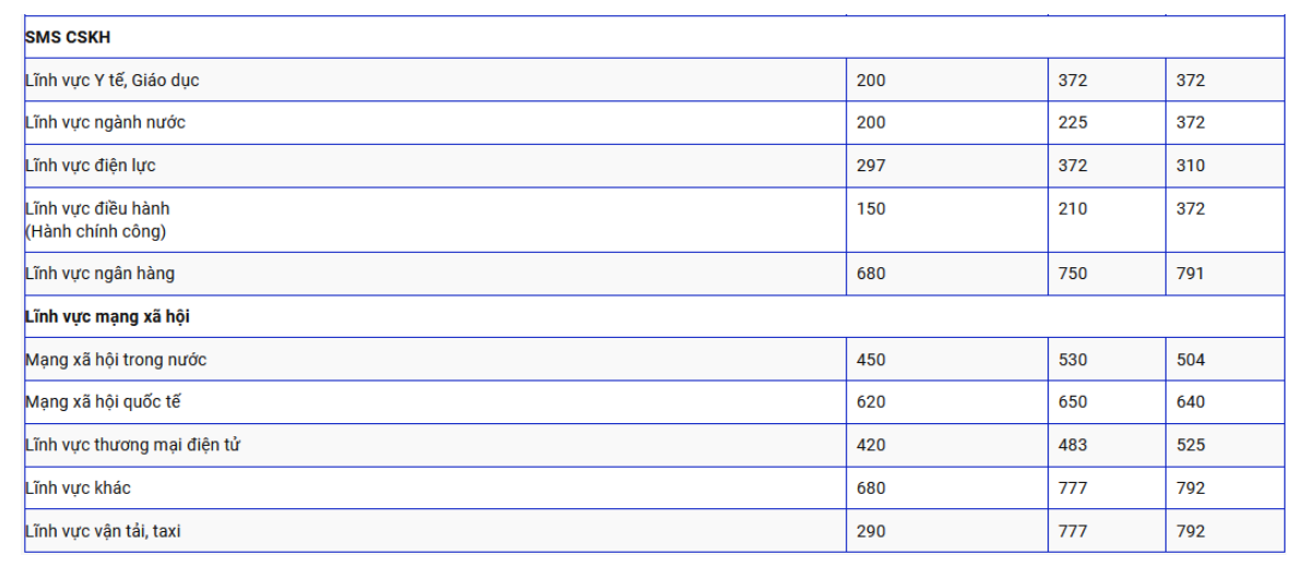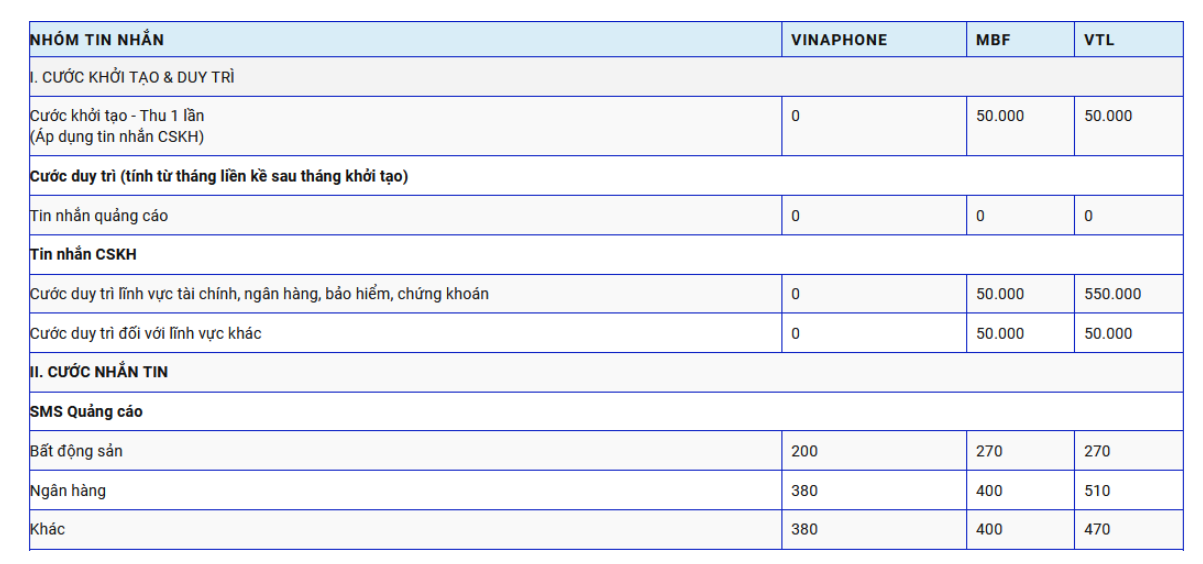 BẢNG GIÁ SMS BRANDNAME VNPT